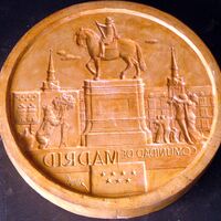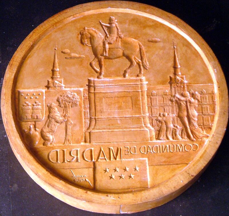 - Molde de escayola del negativo de una medalla de la Comunidad de Madrid en primer término la escultura ecuestre de un rey Borbón junto a una pareja de chulapos bailando el chotis y un oso encaramado a un madroño símbolo del escudo de la capital.