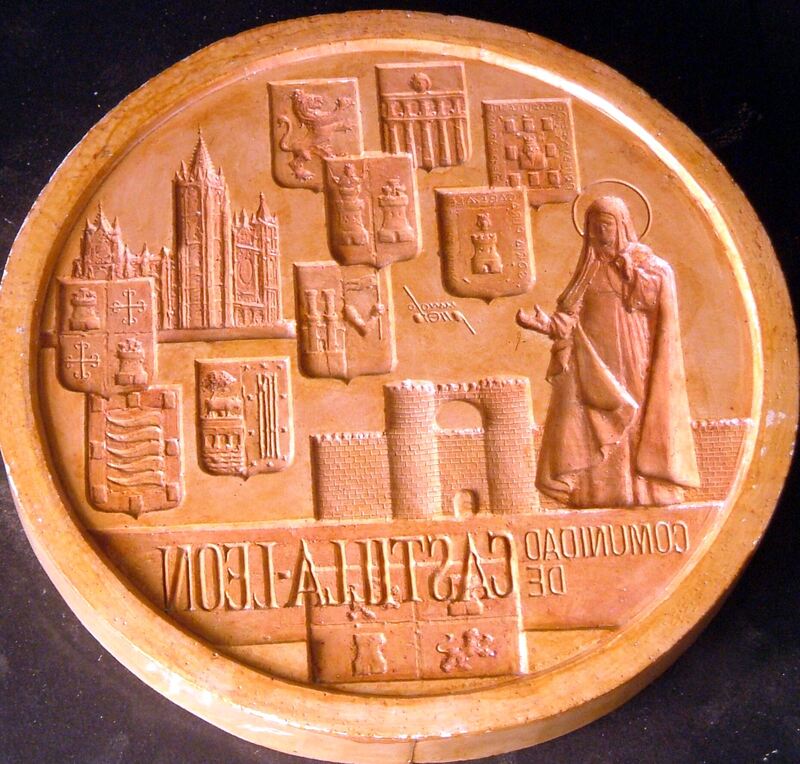 - Molde de escayola del negativo de una medalla de la Comunidad de Castilla León, con la figura de Santa Teresa de Ávila junto a las murallas fortificadas de la ciudad y un conjunto de escudos pertenecientes a la región.