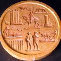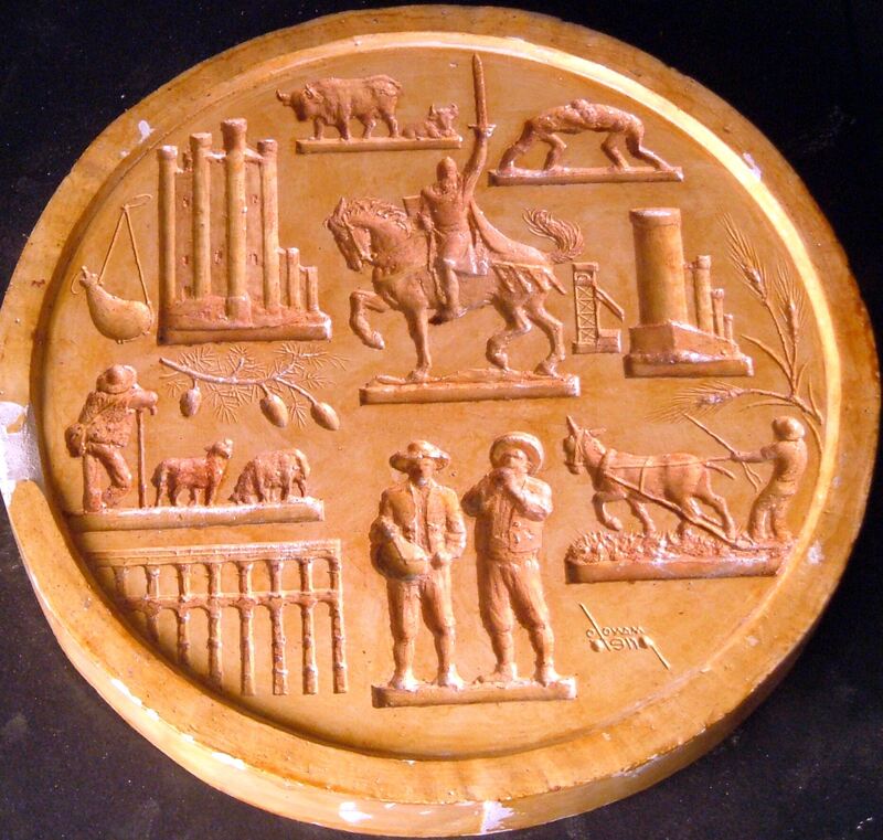 - Molde de escayola del negativo de una medalla de la Comunidad de Castilla León con la imagen central del Cid Campeador a caballo levantando su espada junto a la silueta del acueducto de Segovia y demás elementos característicos de la comunidad.