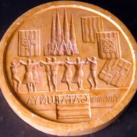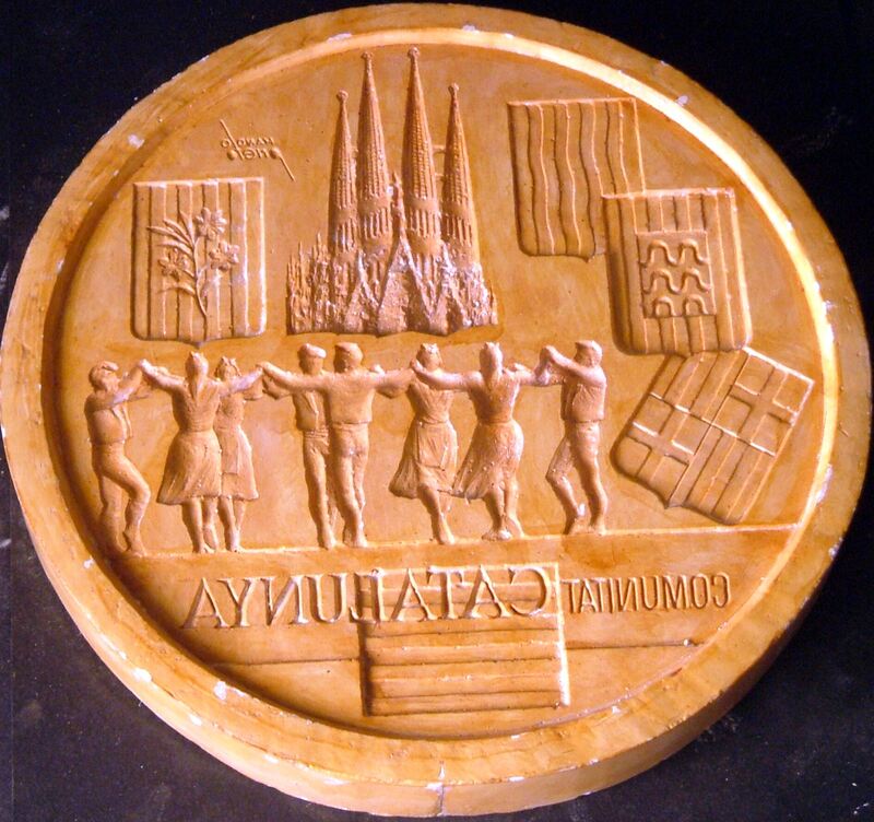 - Molde de escayola del negativo de una medalla de la Comunidad Catalana donde en primer término se aprecia un corro de hombres bailando una sardana junto a la silueta de las agujas de La Sagrada Familia de Gaudí junto a diferentes escudos de la región.