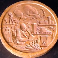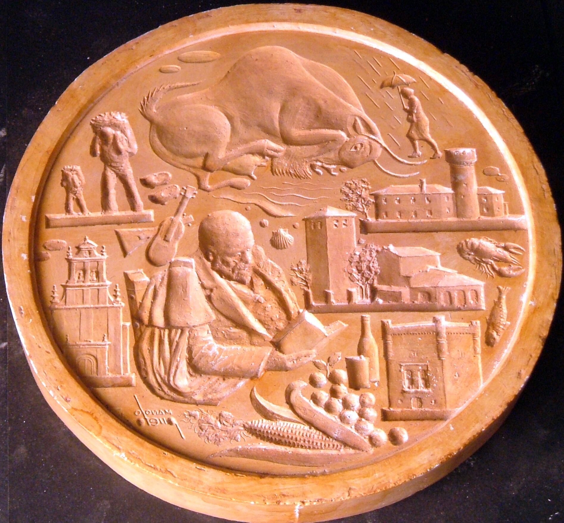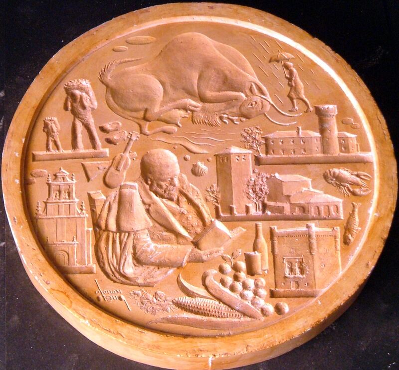 - Molde de escayola del negativo de una medalla de la Comunidad Cantábrica representada por la figura Menéndez Pelayo, la pintura rupestre de un bisonte de Altamira y demás elementos significativos de la región.