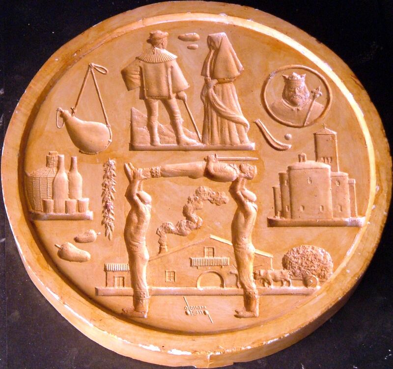 - Molde de escayola del negativo de una medalla de la Comunidad Navarra representado por los elementos y gastronomía característicos de la región, como un caserío, un castillo, etc.