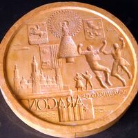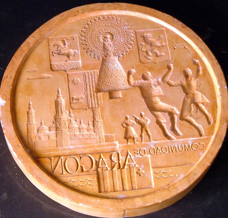 - Molde de escayola del negativo de una medalla de la Comunidad Aragonesa, donde en primer término se aprecia la figura de una pareja de maños bailando una jota, junto a la Virgen del Pilar y la Basílica del Pilar en Zaragoza.Negativo de escayola de la medalla Cdad. De Arsgon Otros archivos: Mbo/360 Mbr/1372