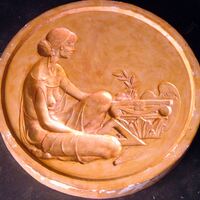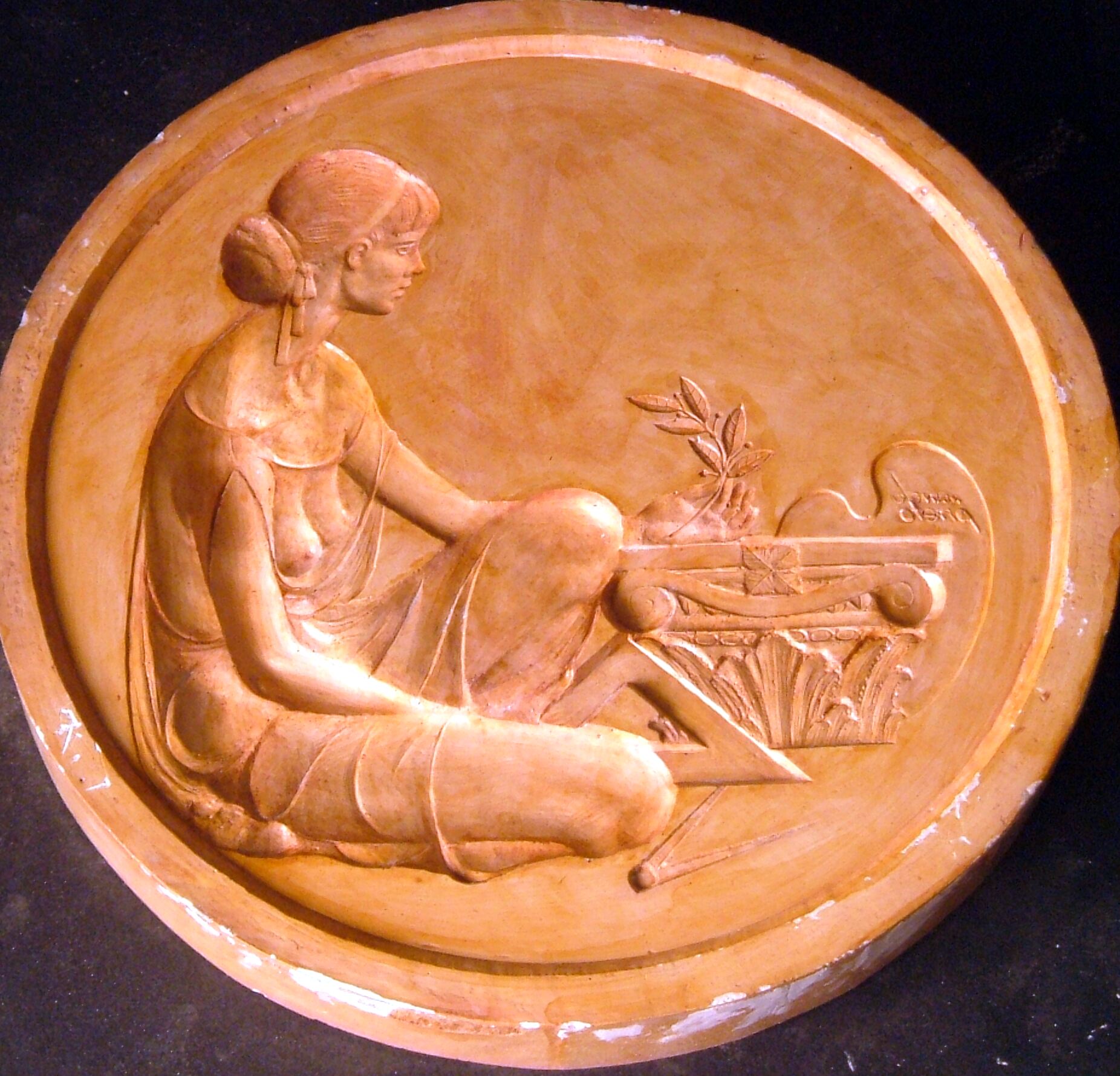 - Molde de escayola del negativo de una medalla donde se representa a una mujer de época romana junto a un capitel de la época donde apoya su mano que sujeta una rama junto a una paleta de pintor, una escuadra y un compás.