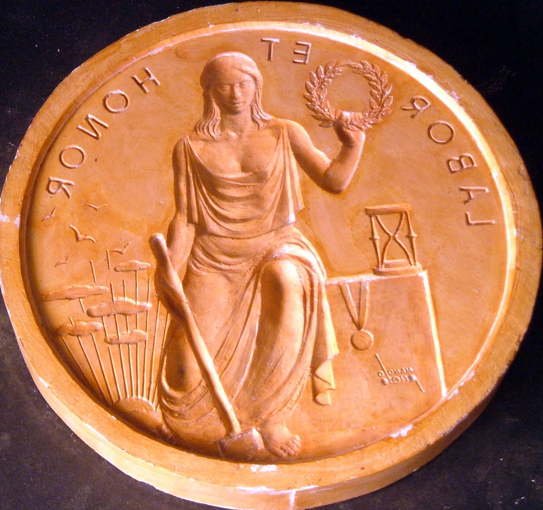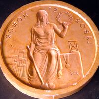 - Molde de escayola del negativo de una medalla que representa a una mujer sentada en un podio que sujeta en una de sus manos una corona de laurel y en la otra una maza junto a una medalla y un reloj de arena.Para Numismática Iberica. Otros Archivos.: MBO/530