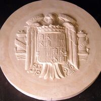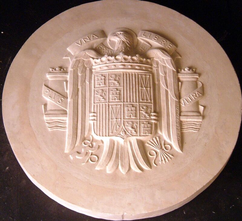 - Molde de escayola del positivo de una medalla que representa el escudo imperial del Régimen Franquista con las cartelas donde se lee “Una, grande y liebre”, con un fondo totalmente plano.