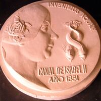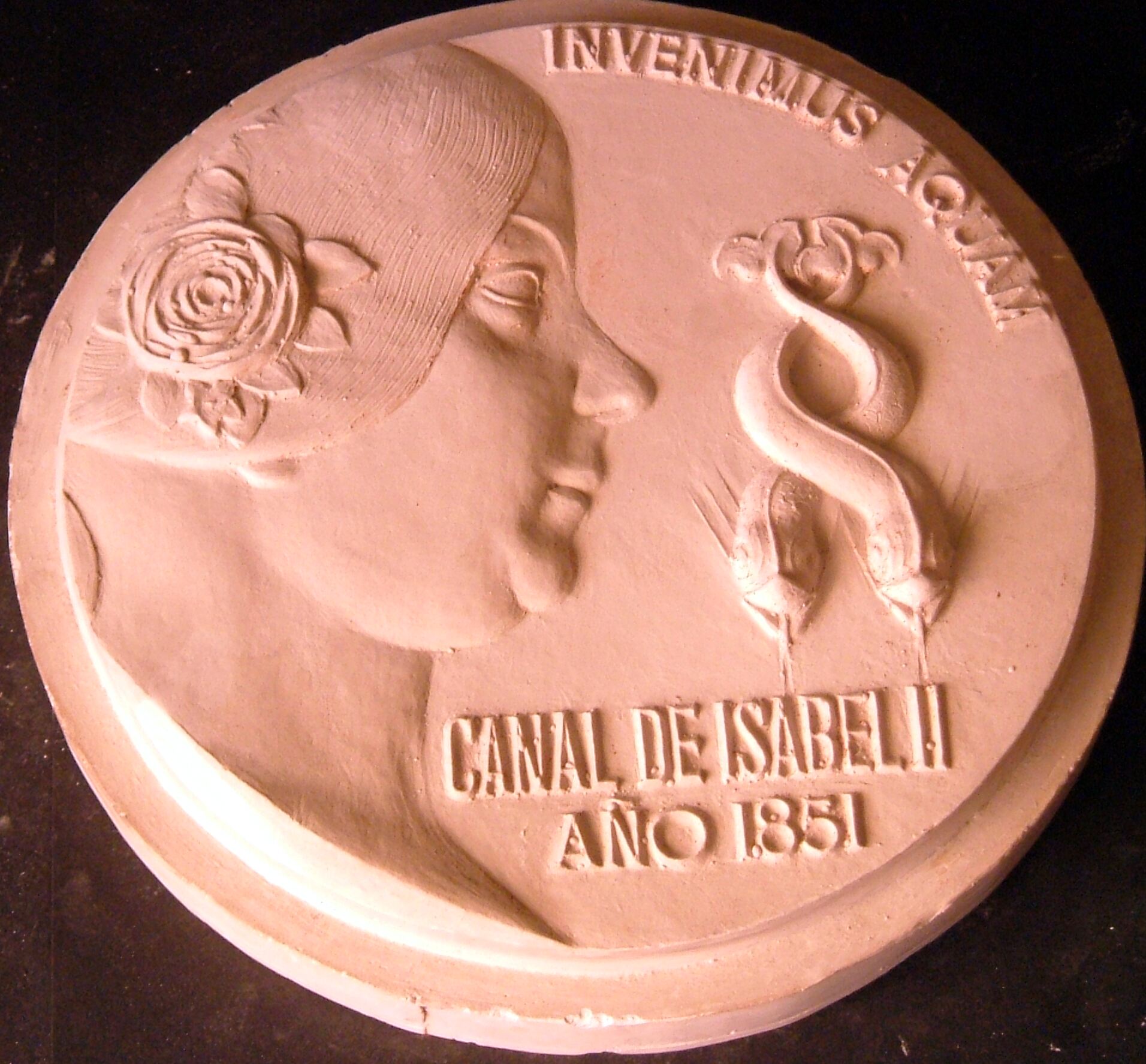 - Molde de escayola del positivo del anverso de la medalla Canal Isabel II que representa el retrato de la famosa Reina junto a la figura de dos delfines entrecruzados que representan la abundancia de agua.