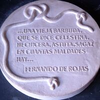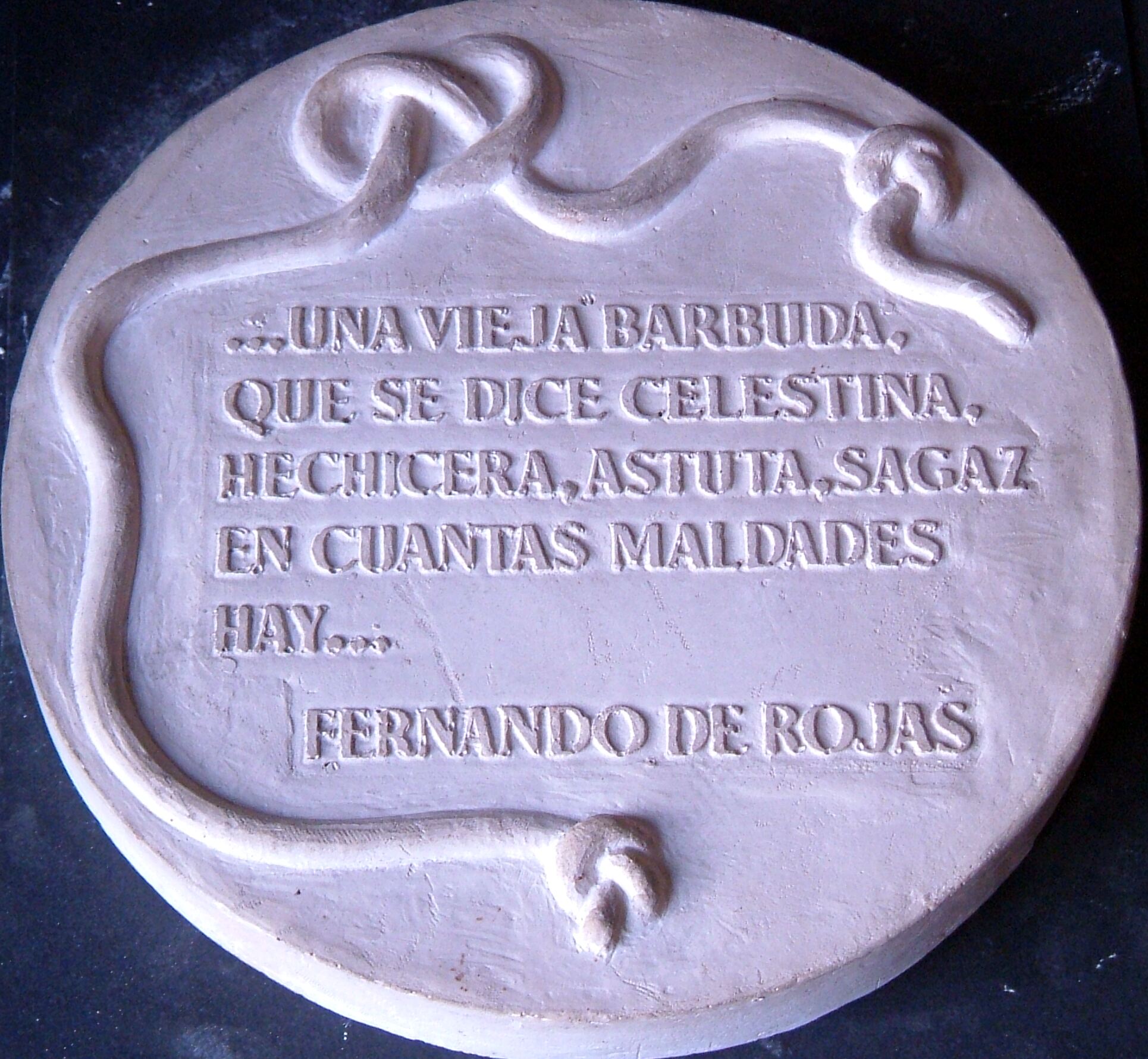 - Molde de escayola en positivo de la medalla representativa de la obra literaria de Francisco de Rojas donde se lee un párrafo de La Celestina: “una vieja barbuda, que se dice celestina”…
