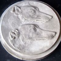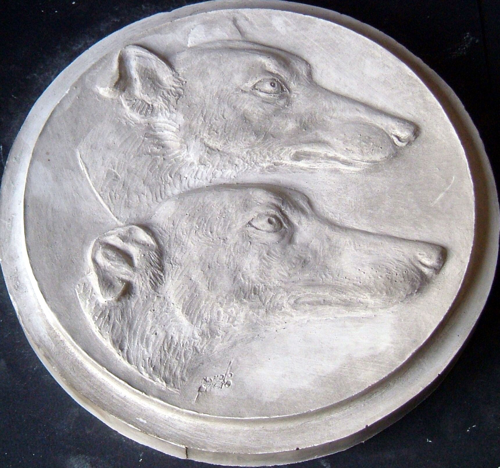 - Molde de escayola de la medalla que representa el perfil de dos cabezas de galgos. Relacionado con los otros estudios de premios y competiciones de Galgos que hemos visto anteriormente.