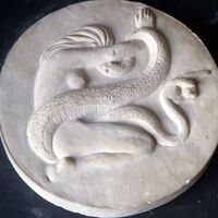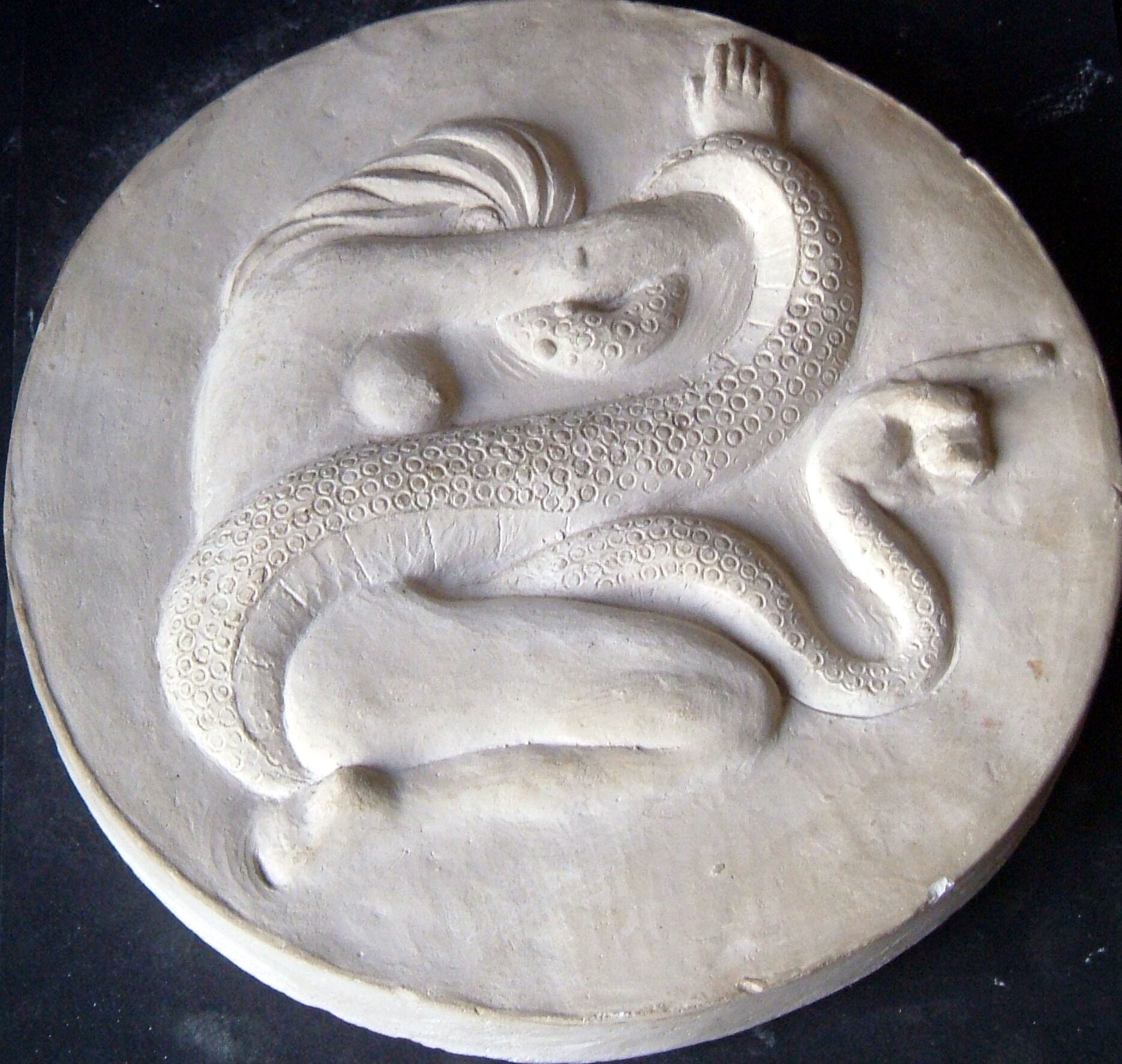 - Molde de escayola del negativo de una medalla donde se representa la figura de una mujer desnuda enrollada en una serpiente cuyo uno de sus extremos termina con la forma de una mano con el dedo extendido señalando una dirección.