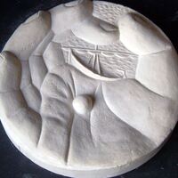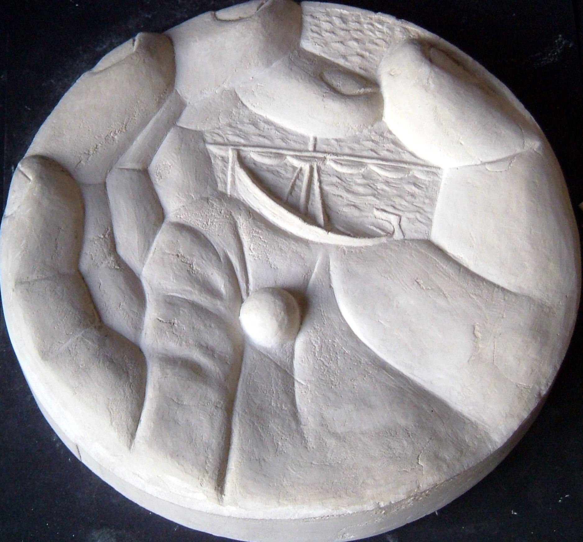 - Molde de escayola del negativo de una medalla donde se representa una palma de una mano que sostiene una bola en el centro y en el espacio que queda de entre sus dedos unidos se aprecia la figura de un barco en el mar.