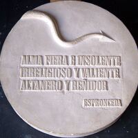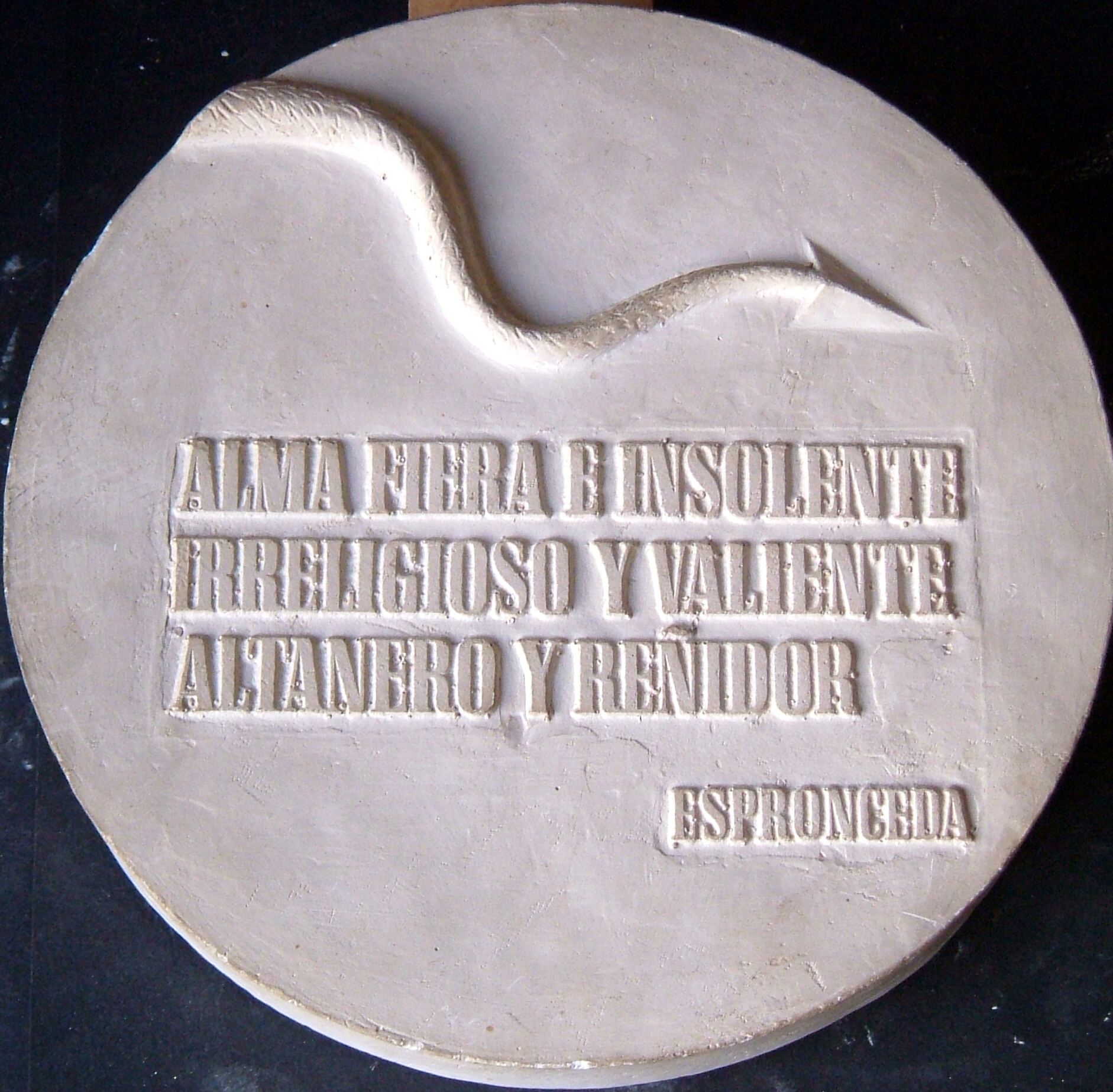 - Molde de escayola del negativo de una medalla donde se aprecia un texto de Espronceda, relacionados con el amor insolente, junto a una cola terminada en punta de un diablo.