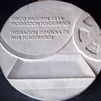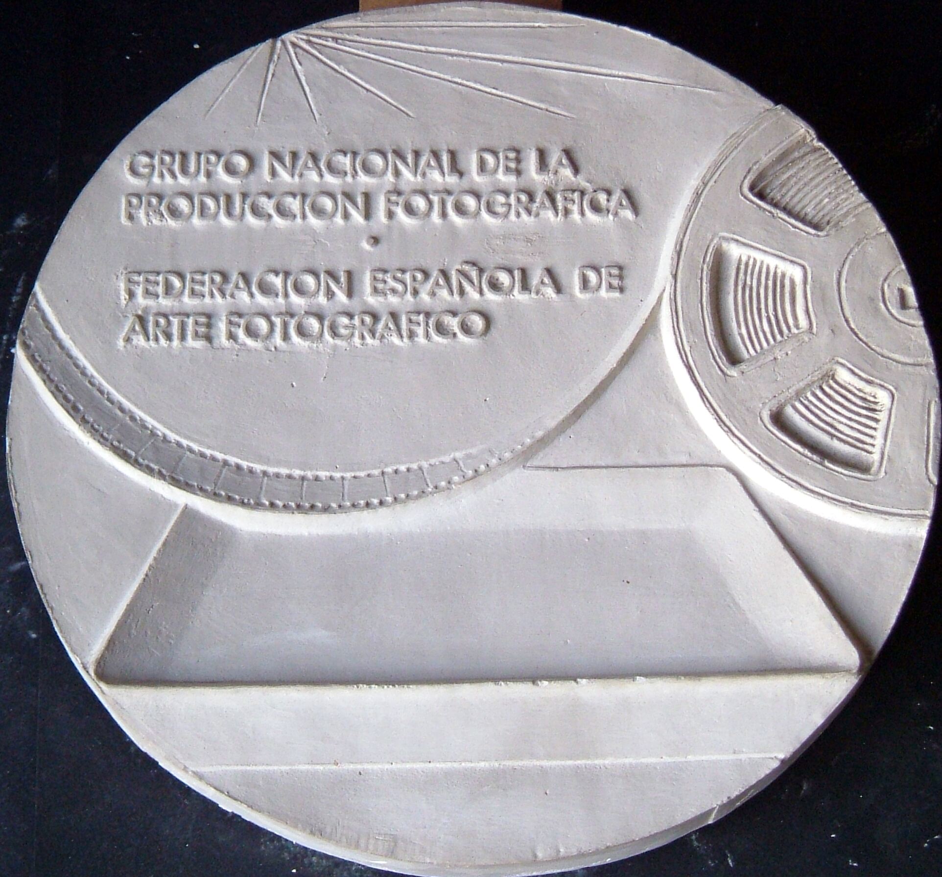 - Molde de escayola del negativo de una medalla donde se aprecia un rollo de una película fotográfica extendida sobre una cubeta junto a la leyenda correspondiente del grupo nacional al que corresponde.