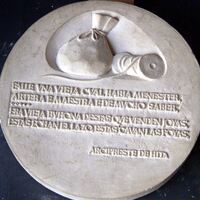 - Molde de escayola del negativo de una medalla donde se representa un párrafo de la obra del Arcepriste de Hita relacionada con el dinero, junto a una bolsa de cuero y una bobina de hilo.