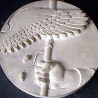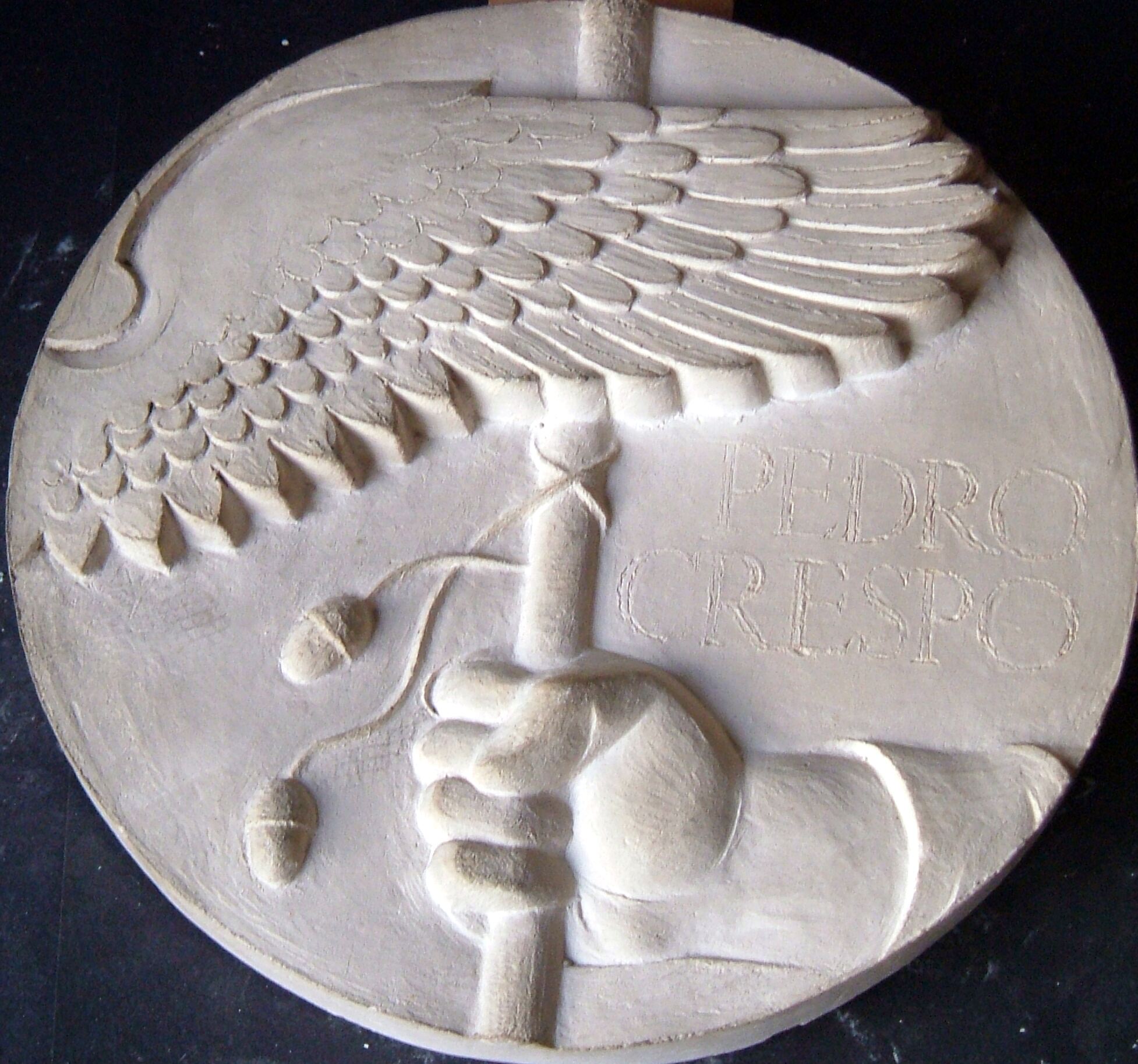- Molde de escayola de una medalla donde se representa una mano que sostiene un bastón de mando donde enrollado cuelga un cordón rematado por unas bellotas junto a una gran ala.