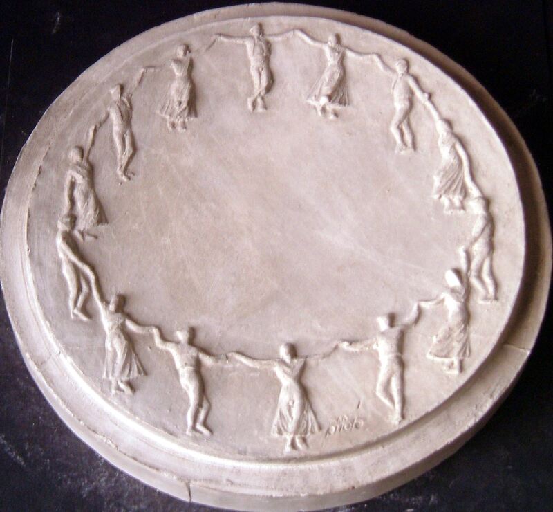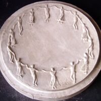 - Molde de escayola de la cara de una medalla donde contorneando todo el perfil de la superficie se aprecia un corro de personas unidas por sus manos bailando, como en una especie de baile de paz.