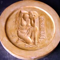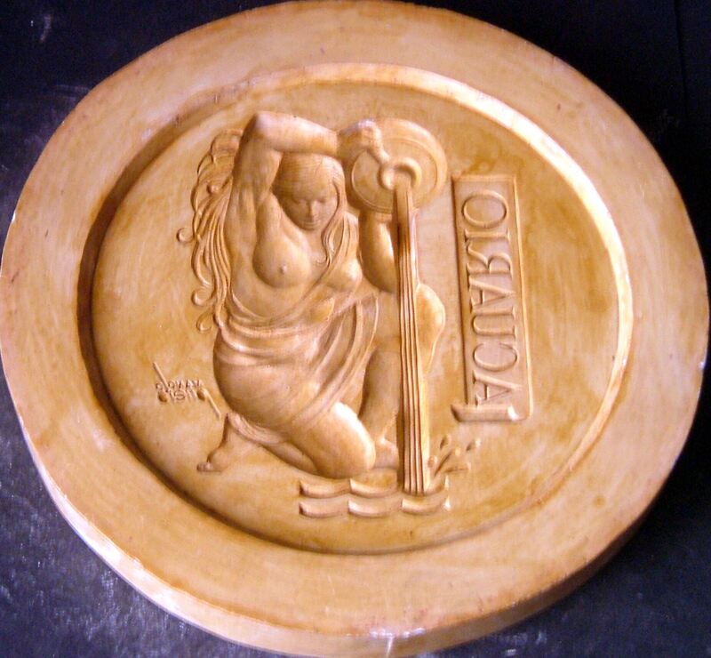 - Molde de escayola con barniz de goma laca de una de las caras de la medalla representativa del signo del zodiaco Acuarios con la imagen de una mujer vertiendo agua del cántaro que sujeta sobre su hombro.OTROS ARCHIVOS: Mbo/319 MG/1415