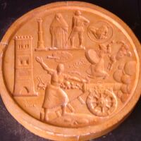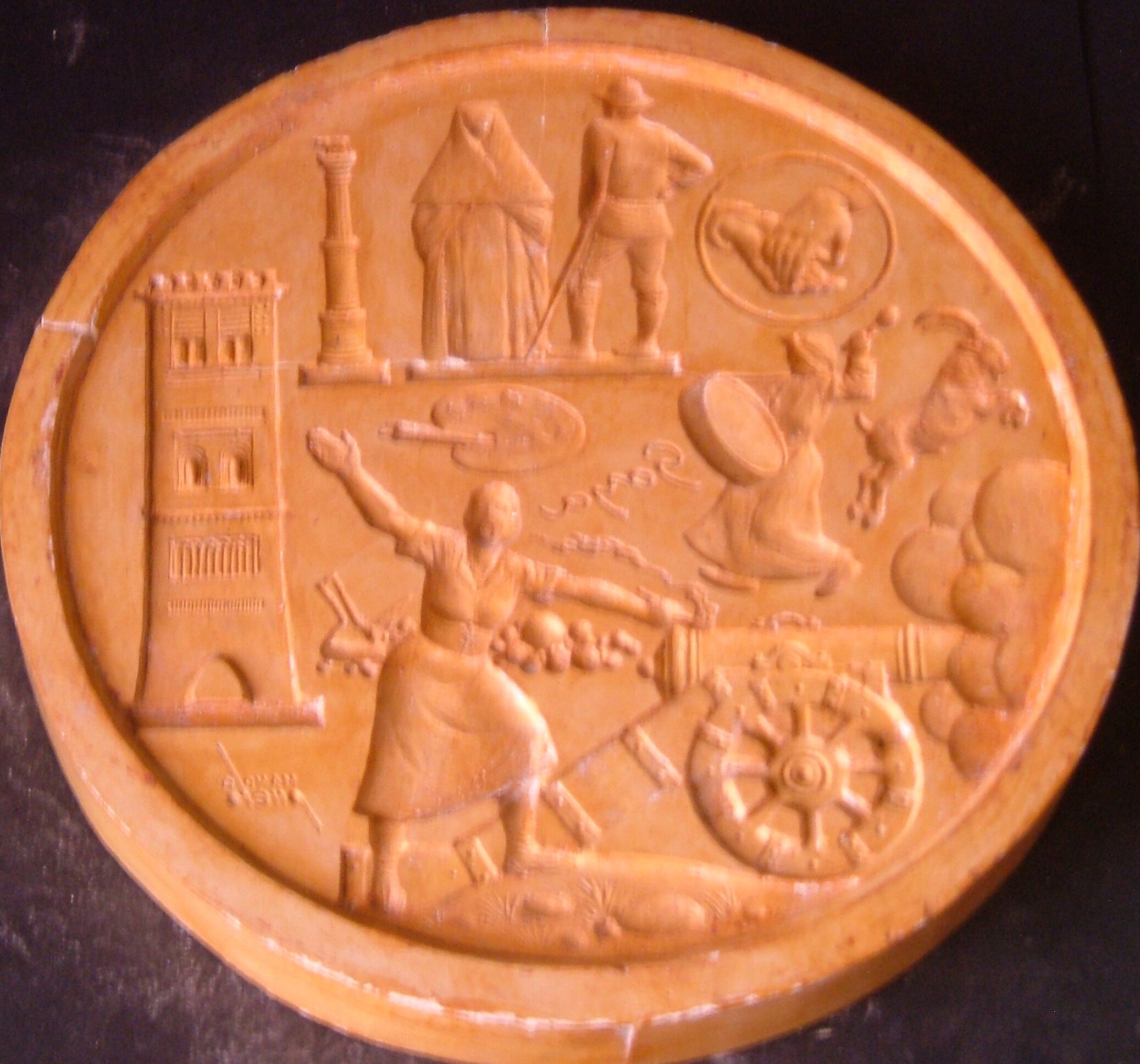 - Molde de escayola con barniz de goma laca de la medalla representativa de Aragón con la imagen de Agustina de Aragón junto a un cañón junto a figuras y elementos características de la región.