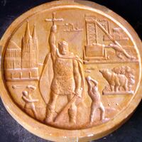 - Molde de escayola de la medalla representativa de Asturias con la figura central de Don Pelayo junto a un oso asturiano y un minero empujando un carro de carbón de las minas asturianas más elementos característicos de la región.