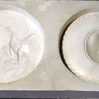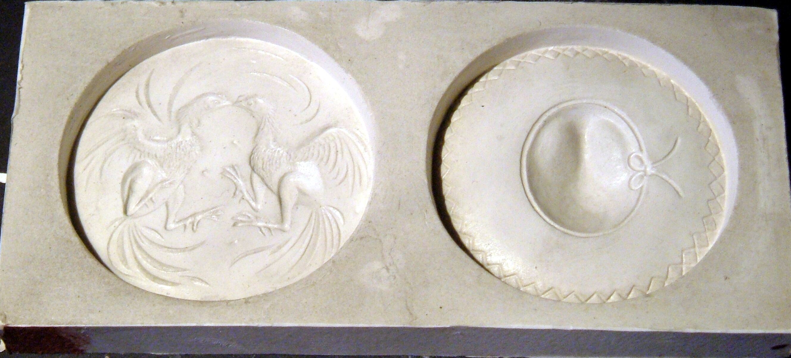- Fotografía de dos moldes de escayola donde en uno de ellos se representa la pelea de dos gallos junto al molde de un sombrero con un cosido en aspa en el ala típico del pais mexicano.