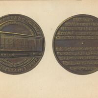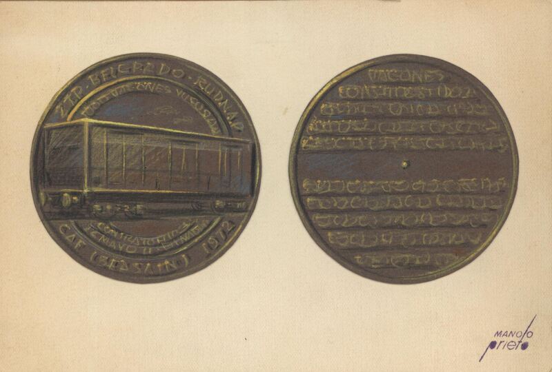 - Dibujo a lápiz de color de las caras de una medalla representativa de una empresa dedicada a la construcción de trenes con la imagen de uno vagón de tren y la leyenda explicativa en el reverso de la medalla.