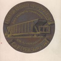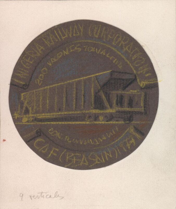 - Dibujo a lápiz de color de la cara de una medalla donde se representa el vagón de un tren junto a la leyenda que bordea del perfil.