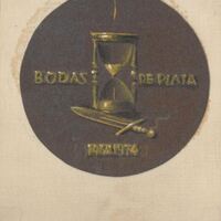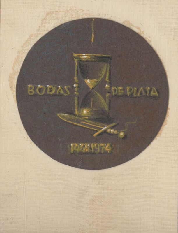 - Boceto con lápices de colores de la cara de una medalla conmemorativa de las Bodas de Plata con la imagen central de un reloj de arena, que simboliza el tiempo, sobre a un puñal.