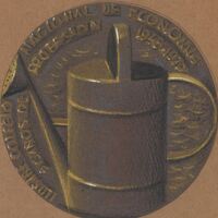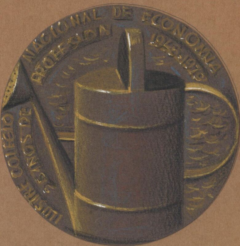- Boceto con lápices de colores de la cara de una medalla donde se aprecia la figura de una regadera que ocupa todo el campo de la medalla contorneada por la leyenda correspondiente.