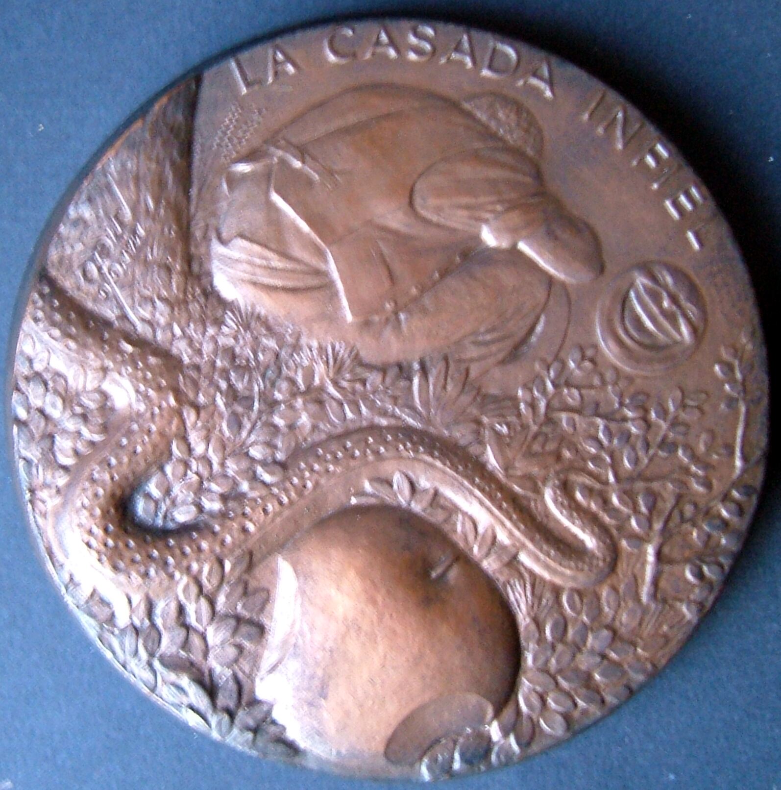 - Bajorrelieve de la cara de una medalla titulada “La casada infiel” con la imagen de un hombre abatido ante la traición cometida por su mujer sentado y apoyado en sus rodillas junto a la silueta de una gran serpiente y una manzana mordida en primer plano.