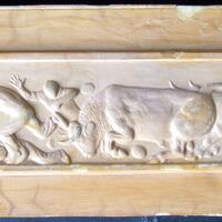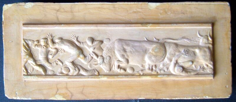 - Interior del molde en positivo del bajorrelieve de un friso donde se representa la escena de unos mozos corriendo delante de los toros en un encierro, y que tiene que ver con la provincia de Navarra.