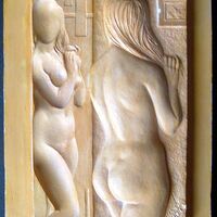 - Molde de escayola cocido donde se aprecia en primer término el cuerpo desnudo de una mujer de espaldas que se mira en un espejo mientras se recoge con sus manos el pelo, y donde se aparece en una imagen en negativo de ella mismo.