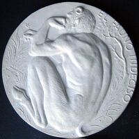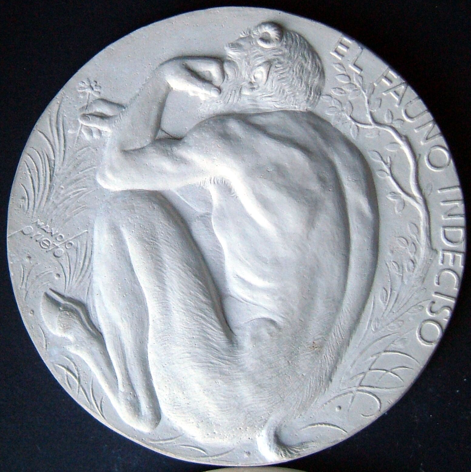 Molde de escayola de la cara de una medalla donde reaprecia la figura de un fauno pensativo.