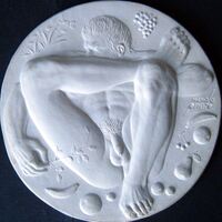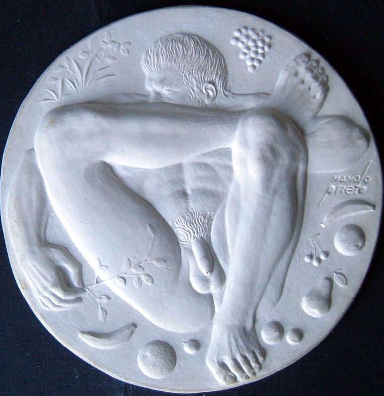 - Molde de escayola de la cara de una medalla donde se aprecia la figura de un hombre desnudo sentado plácidamente rodeado por elementos decorativos frutales.