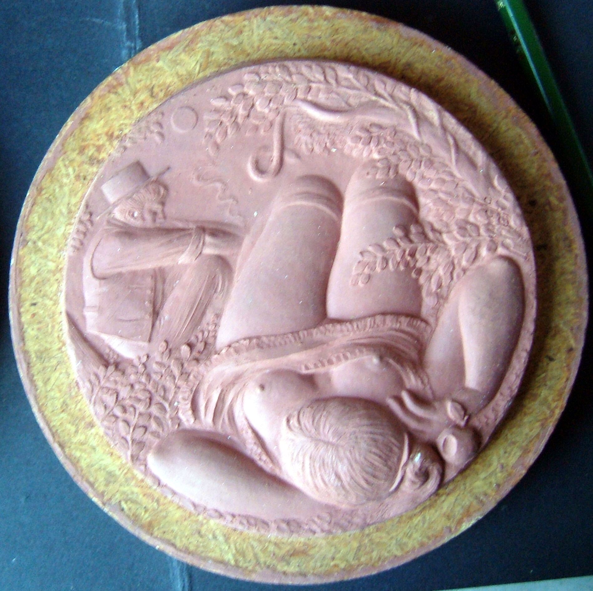 - Molde de escayola de la cara de la medalla titulada La casada infiel, con la imagen en primer término de una mujer tumbada con la falda levantada junto a un hombre sentado abatido por la traición.