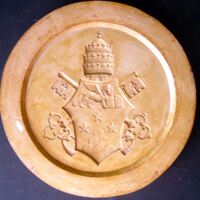 - Molde de escayola de la cara de una medalla donde se aprecia un escudo pontificio con la tiara Papal y las llaves que simbolizan el dominio de san Pedro sobre el cielo y el infierno.Para Instituto Numismático Otros Archivos.: MBO/524 MG/ 1548