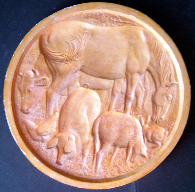 - Molde de escayola, con barniz de goma laca, de la cara de una medalla donde reaprecia un grupo de animales –cerdos, vaca, caballo…-; en primer término un caballo y junto a él el resto de animales.