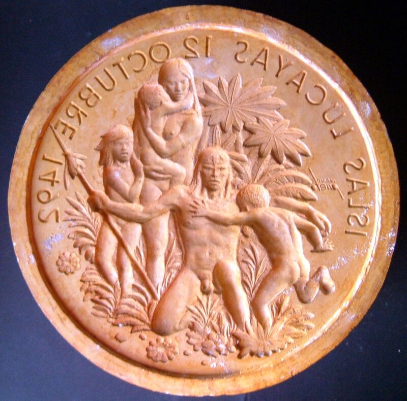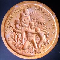 Molde de escayola, con barniz de goma laca, del negativo de la cara de una medalla donde se representa la escena de un grupo de indígenas, en primer término el hombre arrodillado acogiendo en sus brazos a uno de su hijo y su mujer detrás con un niño en sus brazos y una niña junto a ella.Para Numismática Iberica, reverso OTROS ARCHIVOS MBO/402+449+450 MEN/1788 MG/1534+1533 MBR/1344