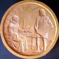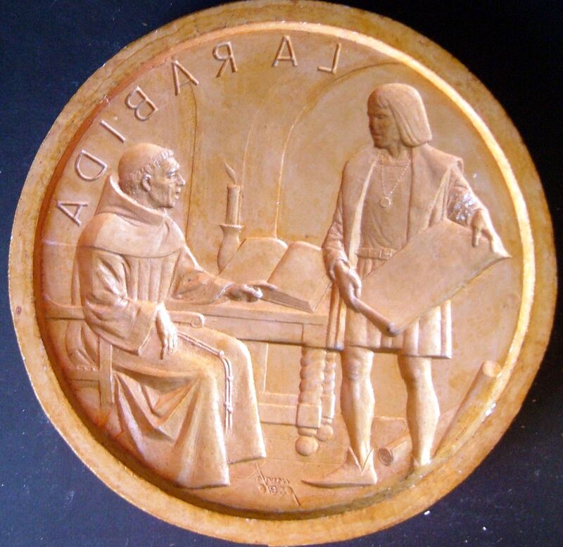 - Molde de escayola, con barniz de goma laca, del negativo (tanto la inscripción como la firma están al revés) de la cara de una medalla donde se aprecia a Colón conversando con un monje de La Rábida.Para Numismática Iberica, anverso OTROS ARCHIVOS RELACIONADOS. MBO/433+396+425 MBR/1367