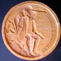 Molde de escayola, con barniz de goma laca, del negativo de la cara de una medalla donde se representa a Colón sentado junto a una sirena que le señala el camino a seguir apoyada en uno de sus hombros.Para Numismatica Iberica, anverso Diametrlo Otros Archivos: MBO/429+383+386+394 MEN/1782 +1783 MG/1528