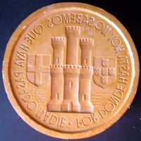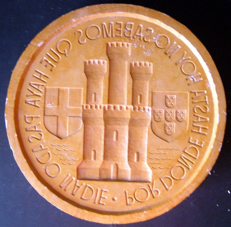 Molde de escayola, con barniz de goma laca, del negativo de la cara de una medalla con la figura de un castillo con varias torres junto a la leyenda que rodea el perfil “por donde hasta hoy no sabemos que haya pasado nadie”.Para Numismatica Iberica, reverso OTROS ARCHIVOS: MBO/429+383+386+394 MEN/1782+1783 MG/1528 MBR/1335