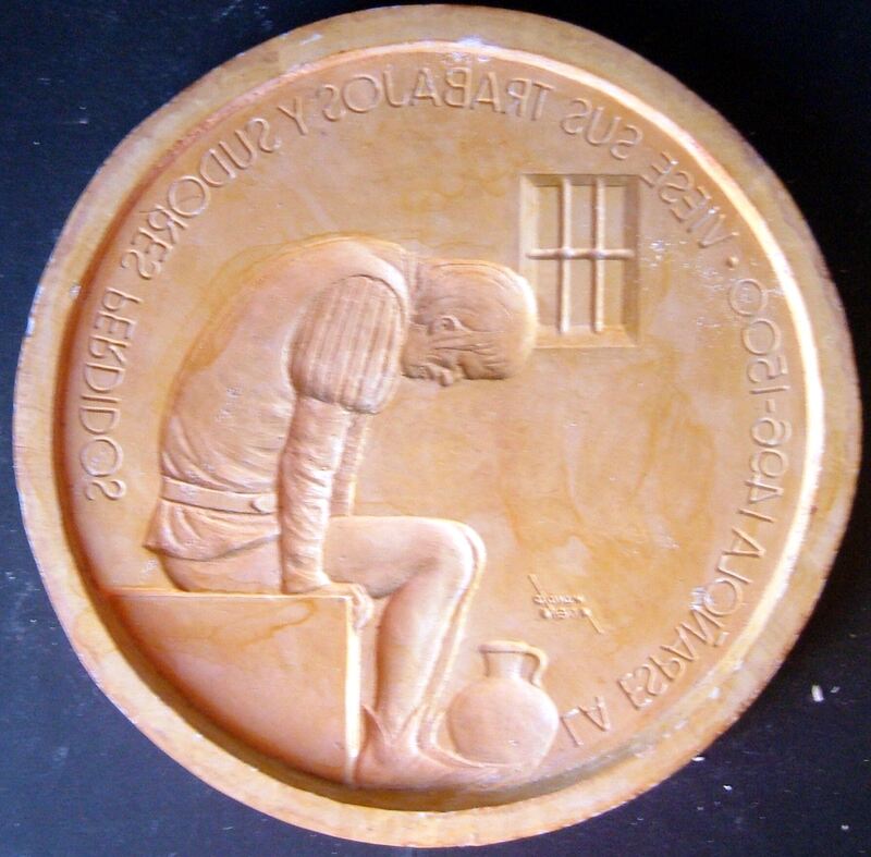 Molde de escayola, con barniz de goma laca, del negativo de la cara de una medalla representativa del cautiverio de Cristóbal Colón donde se le ve abatido junto a la leyenda que dice “viese sus trabajos y sudores perdidos”.Para Numismatica Iberica, OTROS ARCHIVOS: MBO/420+477+478 MBR/1356