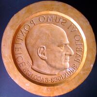 - Molde de escayola, con barniz de goma laca, del negativo (se puede ver que es el negativo por la letras invertidas) de la cara de una medalla con el retrato de perfil del Papa Pablo VI.Realizada por encargo del Instituto Numismático. Otros archivos.: MBO/521