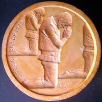 - Molde de escayola, con barniz de goma laca, del negativo de la cara de una medalla donde se representa a un grupo de hombres de rodillas con las palmas de las manos juntas en aptitud de recogimiento.Para Numismática Iberica, reverso