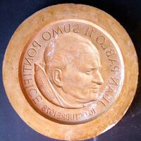- Molde de escayola, con barniz de goma laca, del negativo (toda la inscripción está al revés) de la cara de una medalla donde se representa el perfil del Pontífice Juan Pablo II.Para Acuñaciones Españolas. Otros Archivos.: MBO/527
