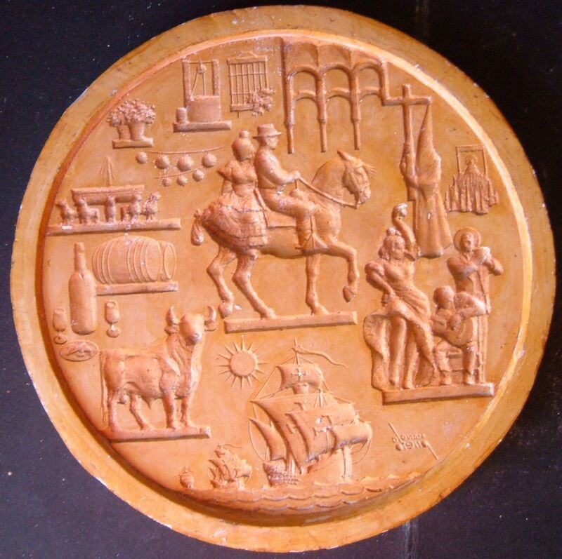 - Molde de escayola, con barniz de goma laca, del negativo de la cara de una medalla representativa de la Comunidad de Andalucía donde se aprecia en el centro una pareja vestidas con trajes andaluces junto elementos y monumentos significativos de la región.