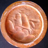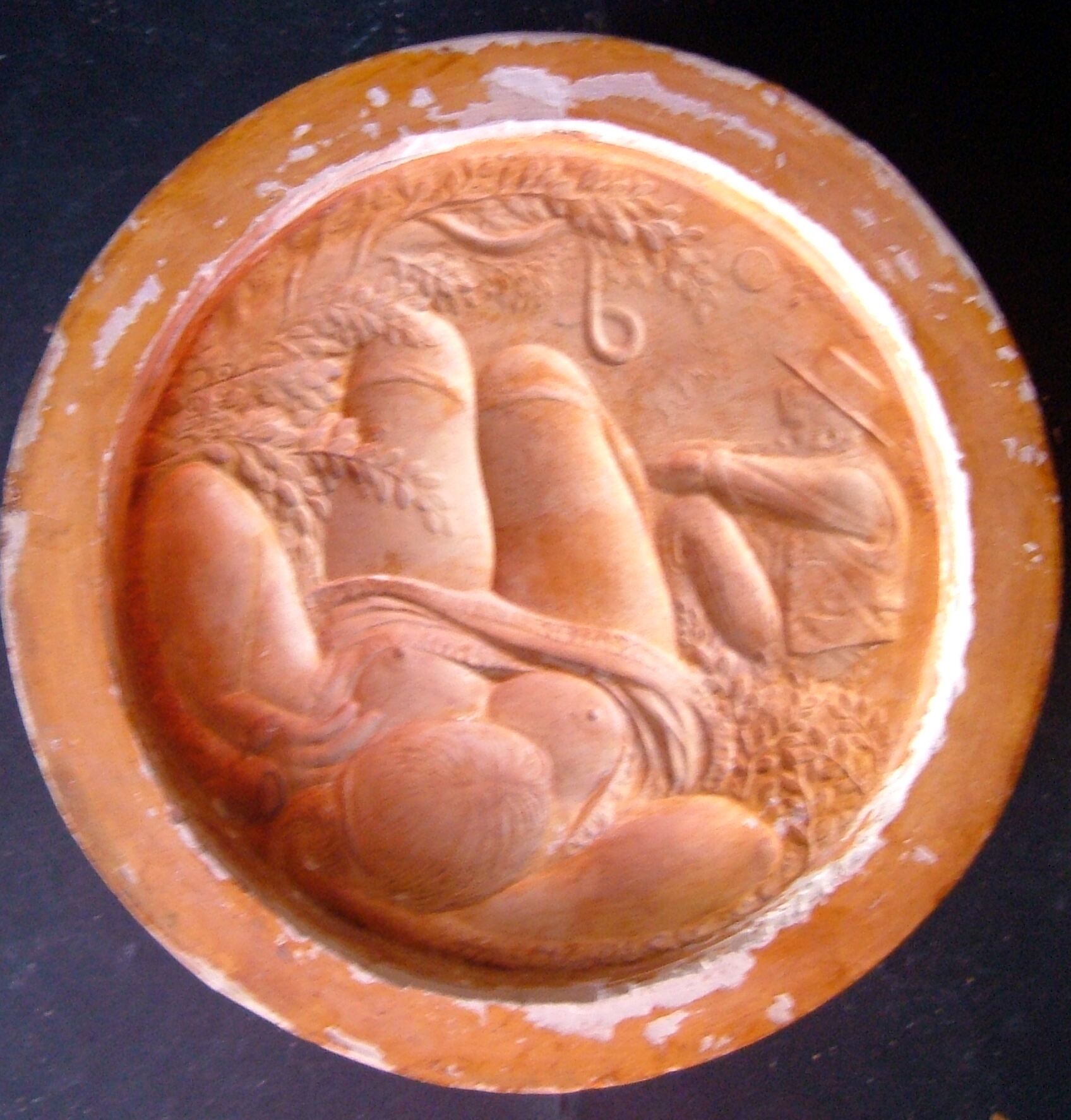 - Molde de escayola del negativo de la cara de una medalla donde se representa en primer término a una mujer tumbada con la falda levantada junto a la figura de un hombre sentado abatido por la traición.