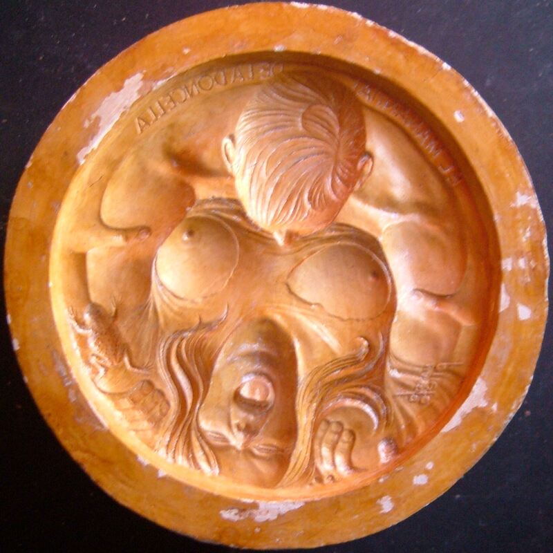 - Molde de escayola del negativo (las letras aparecen invertidas) de la cara de una medalla donde se representa a una mujer forzada por un hombre junto a la leyenda “El manantial de la doncella.”