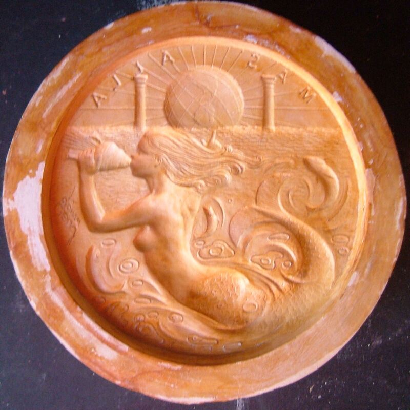 - Molde de escayola del negativo de la cara de una medalla donde se aprecia en primer término una sirena con una caracola en la boca y de fondo un globo terráqueo junto a dos columnas símbolo de todo lo que todavía queda por descubrir.