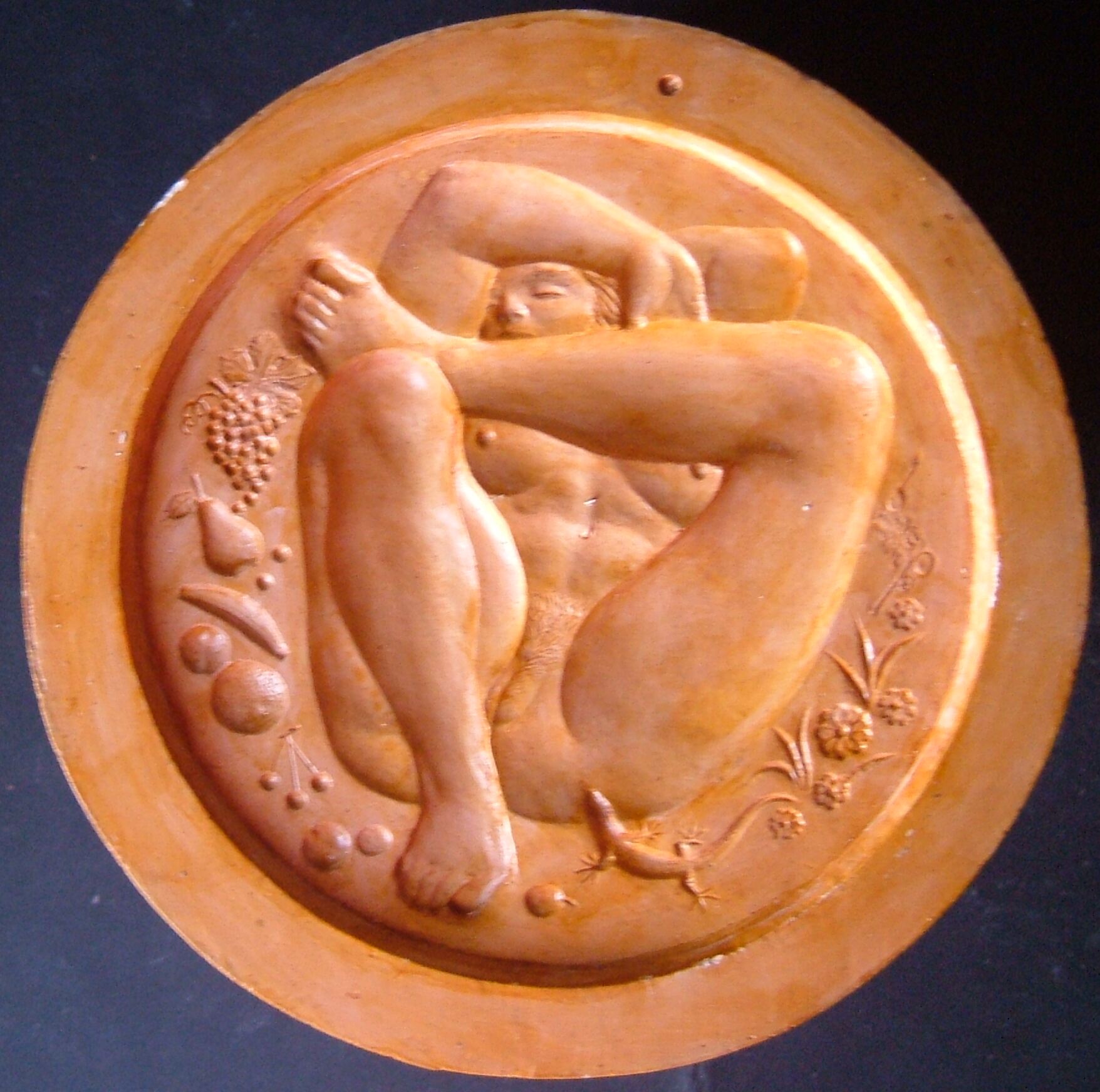 - Molde de escayola del negativo de la cara de una medalla donde se aprecia a una mujer desnuda con una de las piernas apoyada en la otra dejando ver sus partes más íntimas junto a una lagartija y decoración frutal.