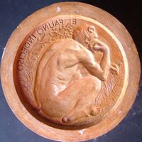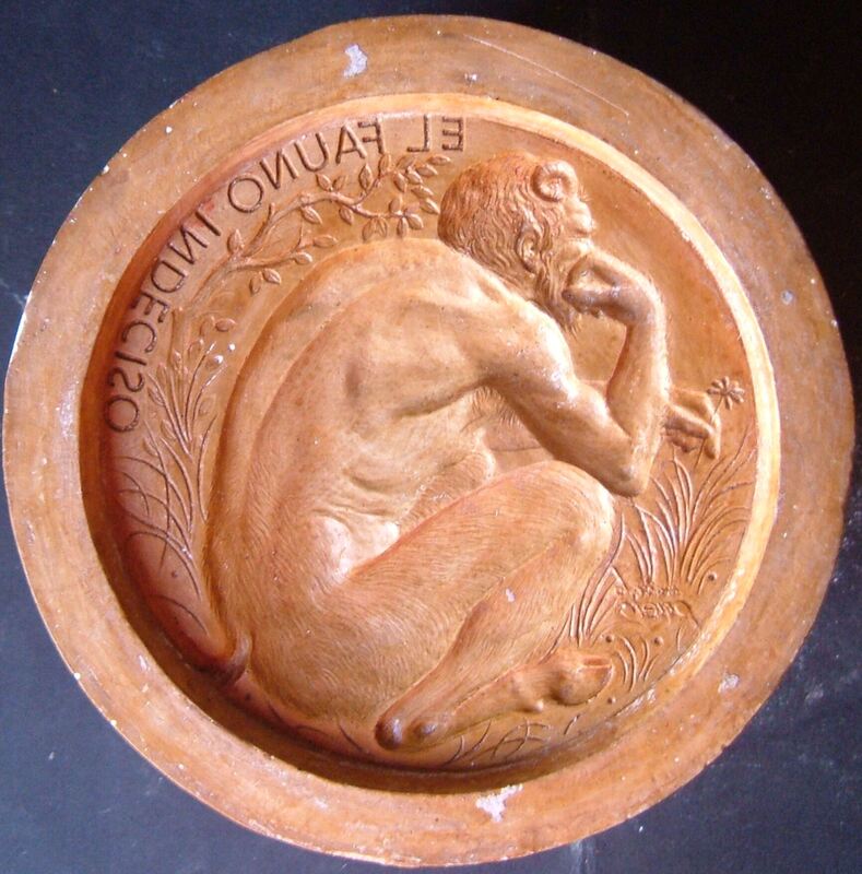 - Molde de escayola, con restos de goma laca, del negativo (las letras aparecen invertidas) de la cara de una medalla donde ase aprecia un fauno pensativo de espaldas apoyando su cabeza en una de sus manos.